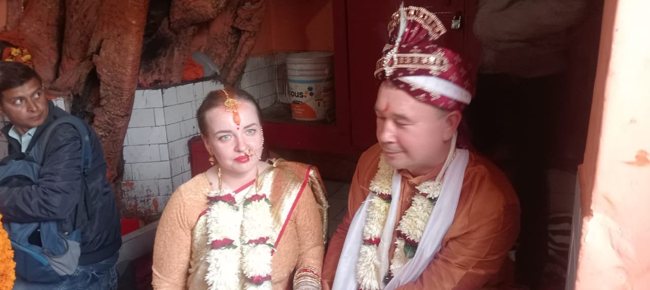 रूसी कपल कोंस्टेंटिन मरिंग (40) और मरीना (36) ने दशाश्वमेध घाट के किनारे एक मंदिर में हिंदू रीति-रिवाजों से शादी रचाई। दोनों ने वैदिक मंत्रोच्चारण के साथ एक-दूसरे के साथ फेरे लिए।