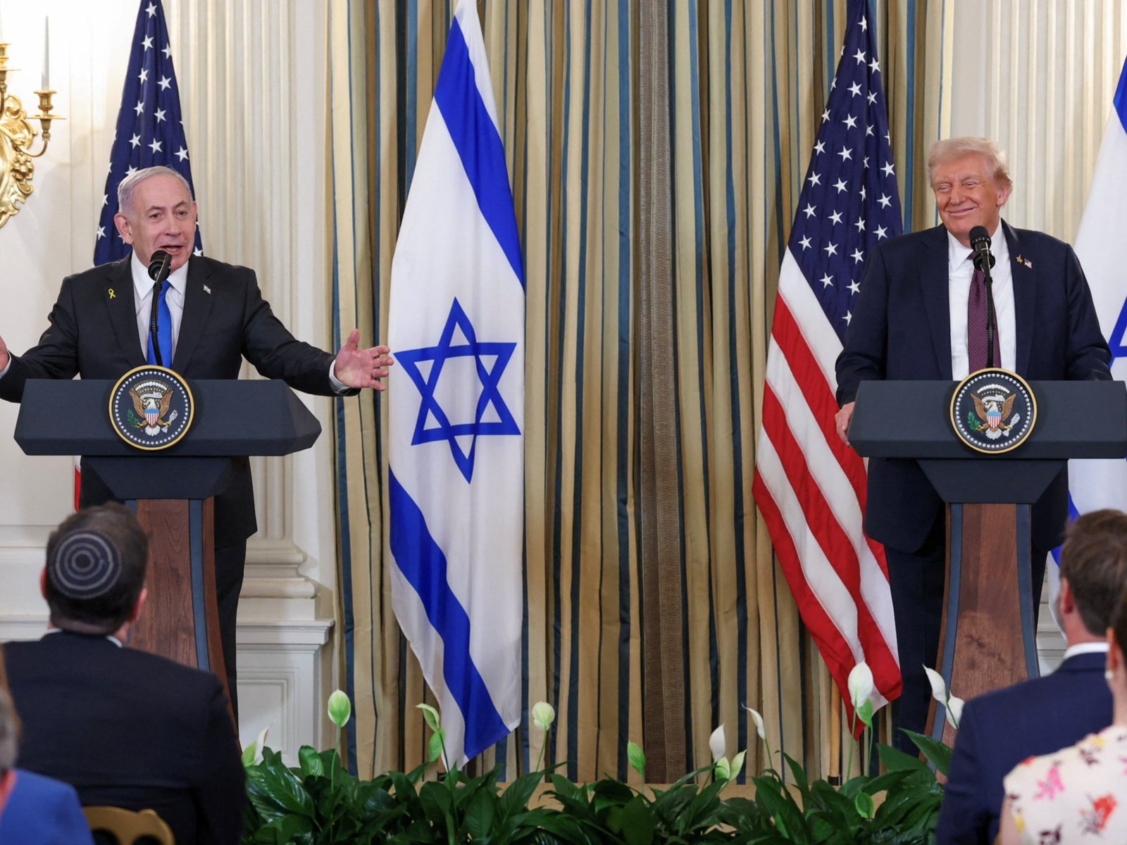 ट्रम्प ने नेतन्याहू से पूछा कि क्या वे कुछ इजराइली पत्रकारों के सवाल लेना चाहेंगे, इस पर नेतन्याहू ने कहा कि मैं आपके फैसले पर भरोसा करूंगा। इसके बाद रिपोर्टर्स सवाल पूछने लगे, लेकिन दोनों नेताओं ने हाथ मिलाया और वहां से चले गए।