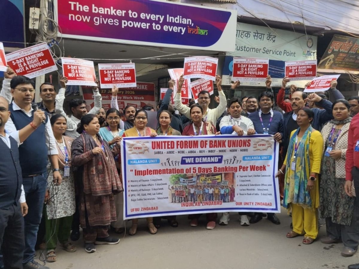 नालंदा में बैंक कर्मियों की हड़ताल:यूनाइटेड फोरम ऑफ बैंक यूनियंस के बैनर तले प्रदर्शन, फाइव-डे बैंकिंग की मांग कर रहे