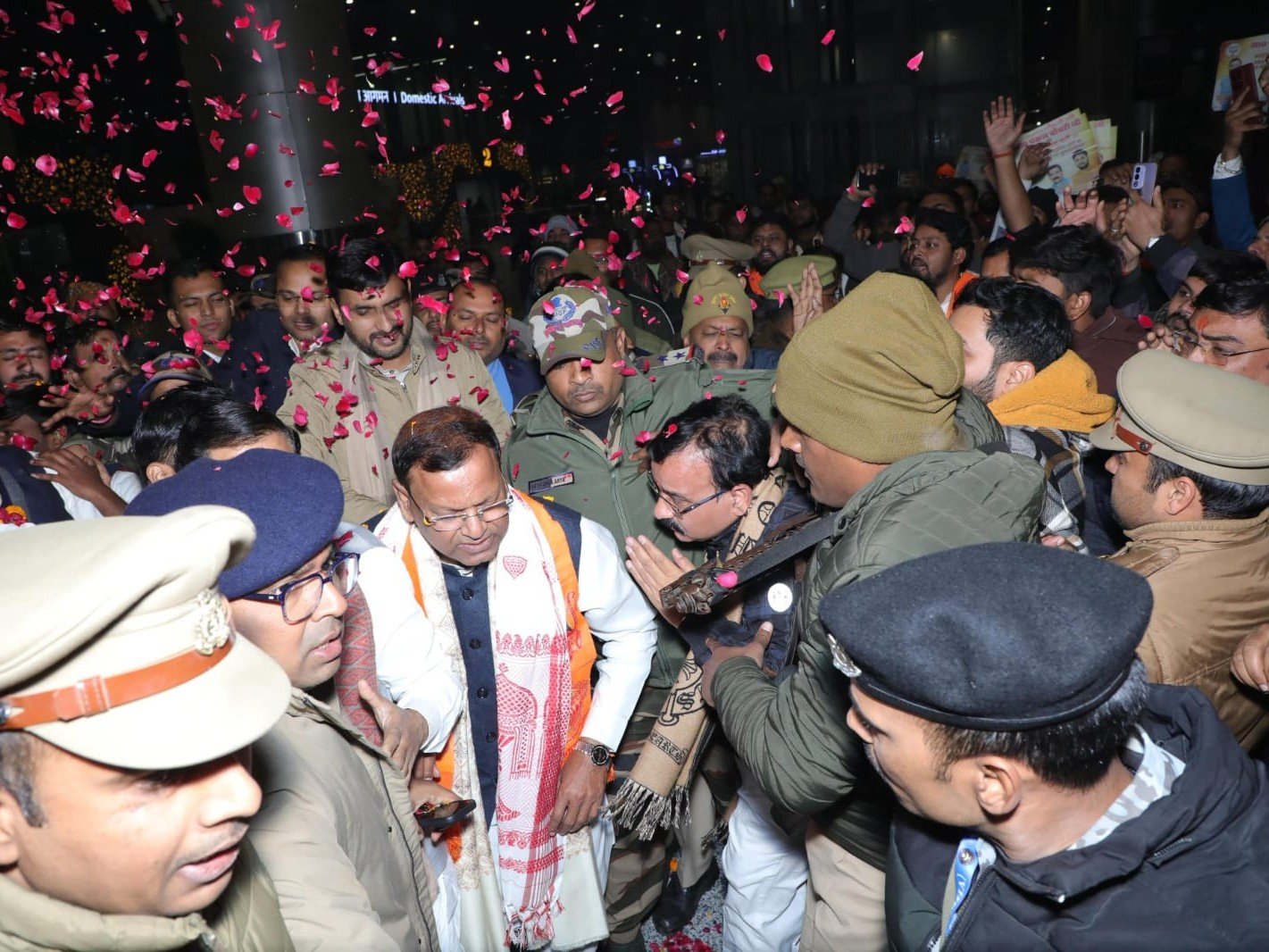 लखनऊ एयरपोर्ट पर भाजपा प्रदेश अध्यक्ष पंकज चौधरी का स्वागत:एयरपोर्ट पर गाजे-बाजे के साथ किया गया स्वागत, संजय राय और नीरज सिंह रहे मौजूद